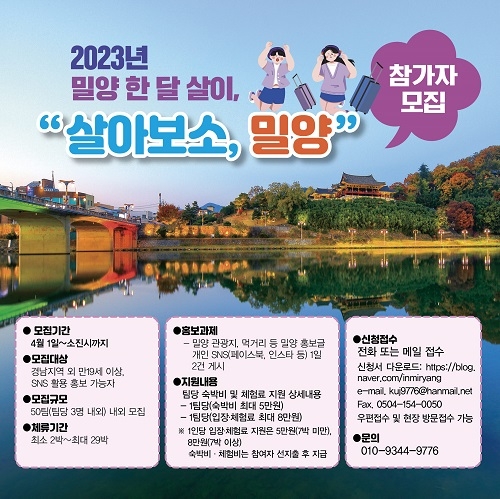 '2023 밀양 방문의 해'를 맞아 관광객 맞이에 한창인 경남 밀양시가 지난해에 이어 올해도 4월 1일부터 밀양 한 달 살이 '살아보소, 밀양' 참가자 모집을 시작한다.