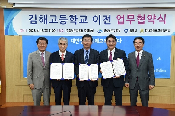 김해시와 경남도교육청, 김해고등학교총동창회는 13일 오전 도교육청에서 김해고등학교 이전 재배치를 위한 업무협약을 체결했다.