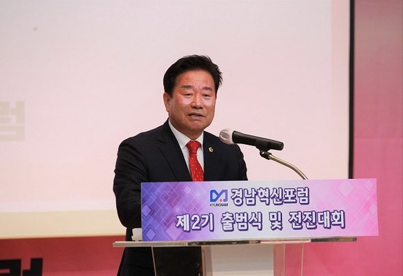 김진부 경남도의회 의장이 지난 16일 진주 경상국립대학교에서 열린 제2기 경남혁신포럼 출범식 및 전진대회에서 상임대표로 취임했다.