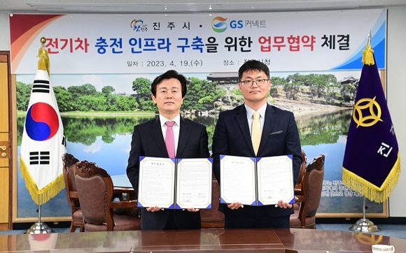경남 진주시는 19일 시청 기업인의 방에서 GS커넥트(주)와 '전기차 충전 인프라 구축을 위한 업무협약'을 체결했다.