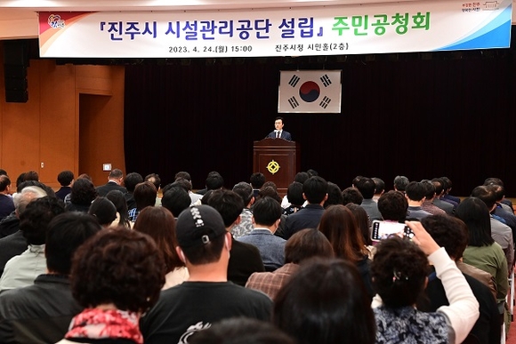 경남 진주시는 24일 오후 시청 시민홀에서 시민, 민간전문가, 시의원, 공무원 등 200여 명이 참석한 가운데 '진주시 시설관리공단 설립' 주민공청회를 가졌다.