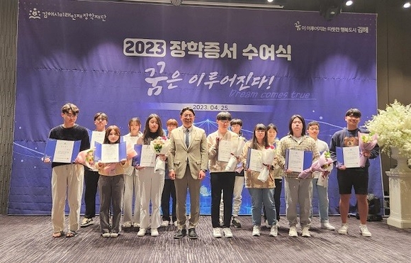 김해시미래인재장학재단은 25일 오후 김해비즈컨벤션홀에서 홍태용 시장과 현종원 재단 이사장, 류명열 시의회 의장, 장학생 등 120여명이 참석한 가운데 '꿈은 이루어진다'는 주제로 2023년 장학증서 수여식을 가졌다.