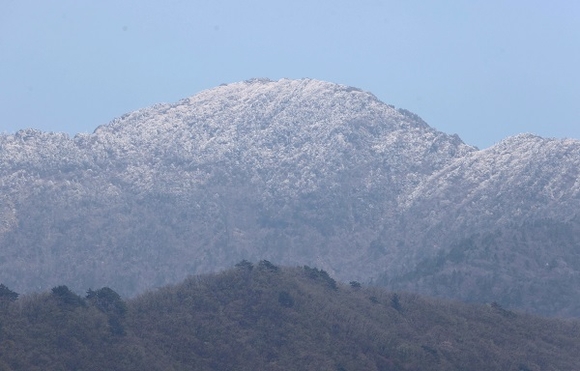 26일 경남 함양군 마천면에서 바라본 지리산 천왕봉이 봄을 시샘하듯 눈이 내려 있다. (사진=함양군 제공)