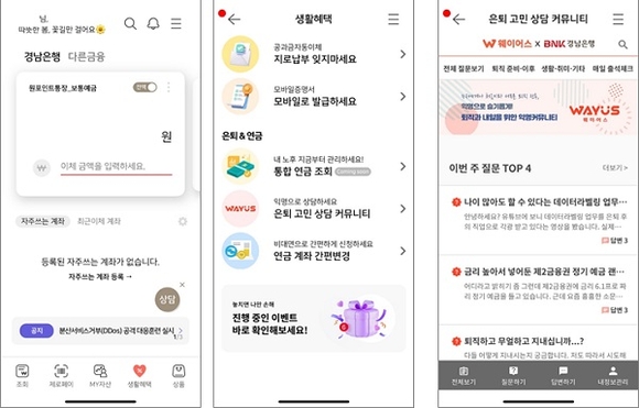 이경기 디지털전략부장은 “BNK경남은행 모바일뱅킹앱에 선보인 은퇴&연금 서비스는 고객들이 은퇴 후 행복한 노후를 위해 사전에 알아보고 준비할 수 있는 서비스들로 구성됐다. 향후에도 고객들에게 유용한 정보를 추가로 제공할 수 있도록 최선을 다하겠다”고 말했다.
