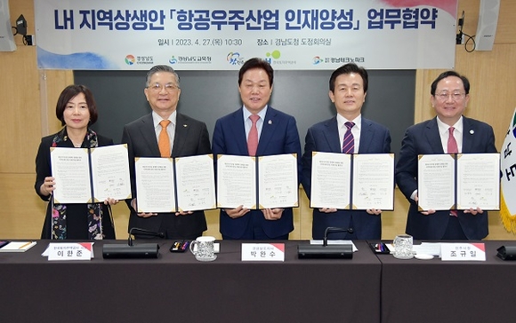 경남도는 27일 도청 도정회의실에서 항공우주산업의 경쟁력 확보와 지역인재 육성을 위해 경남도교육청, 진주시, 한국토지주택공사(LH), 경남테크노파크(경남TP)와 '항공우주산업 인재양성 사업' 업무협약을 체결했다.