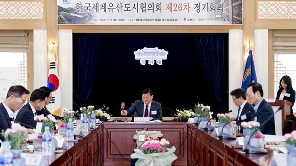 경남 합천군은 제26차 한국세계유산도시협의회 정기회의가 지난 9일 합천영상테마파크 청와대세트장에서 협의회장인 김윤철 군수와 부회장 심덕섭 고창군수를 비롯한 회원도시 대표 등 60여명이 참석한 가운데 개최됐다고 10일 밝혔다.