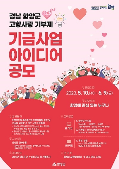 경남 함양군은 내달 9일까지 전 국민을 대상으로 고향사랑기부제 기금사업 아이디어 공모전을 진행한다고 11일 밝혔다.