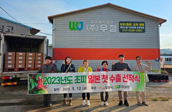 경남 밀양시는 12일 상동면 농업회사법인 ㈜우정에서 생산농가와 시 직원 등이 참석한 가운데 초피 일본 수출 선적식을 가졌다.