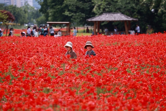 초여름 더위를 보인 15일 경남 함양군 상림공원에서 양귀비꽃이 활짝피어 관광객들을 유혹하고 있다. (사진=함양군 제공)