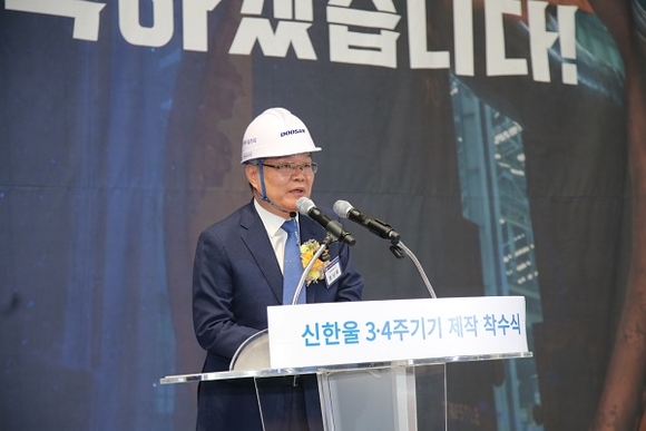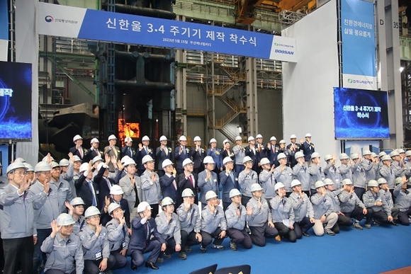 신한울 3‧4호기 원자력 발전소 건설 재개에 따른 주기기 제작 착수식이 15일 경남 창원시 두산에너빌리티 공장에서 열렸다.