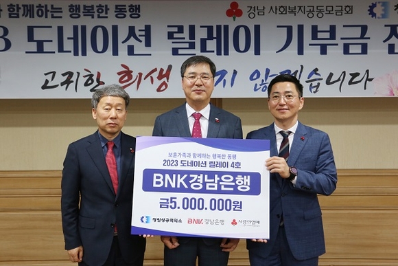 BNK경남은행이 지난 17일 창원상공회의소와 경남사회복지공동모금회가 공동 추진하는 보훈 가족과 함께하는 행복한 동행 '2023 도네이션 릴레이 캠페인' 제4호 동행자로 참여하며 기부금 500만원을 전달했다.
