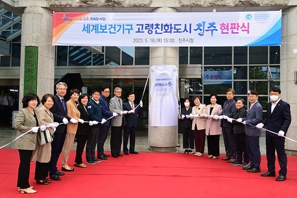 경남 진주시는 18일 시청 정문에서 세계보건기구(WHO)의 '고령친화도시 인증'을 기념하는 현판식을 가졌다.