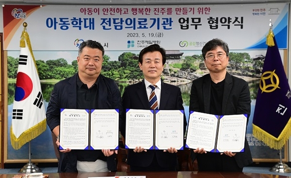 경남 진주시는 19일 기업인의 방에서 진주제일병원, 공감정신건강의학과의원과 '아동학대 전담의료기관 업무협약'을 체결했다.
