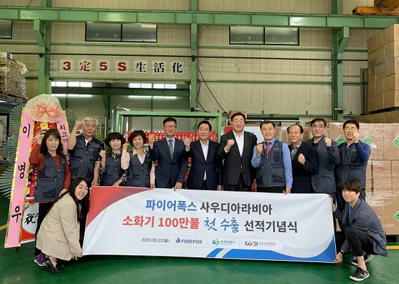 경남 창원시와 창원산업진흥원은 22일 진해 마천 일반산업단지내 소재하고 있는 소화기 제조 전문기업인 파이어폭스에서 사우디아라비아 100만불(약 14억원) 수출 계약 중 1차 선적 물품인 14만불(약 2억원) 상당의 물품에 대한 첫 수출 선적식을 가졌다고 밝혔다.