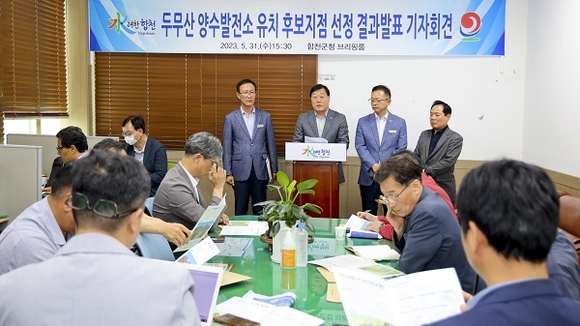 경남 합천군은 지난 31일 묘산면 산제, 가야, 반포 이장과 봉산면 압곡1, 2, 3구 마을 이장과 간담회를 거쳐 두무산 양수발전소 유치 후보지를 상부저수지는 묘산면 산제리 일원, 하부저수지는 묘산면 반포리 일원으로 결정했다고 밝혔다.