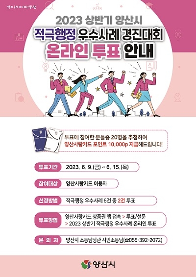 경남 양산시는 시민이 체감하는 적극행정 성과를 발굴하고 널리 확산·공유하기 위해 2023 상반기 적극행정 우수사례 온라인 투표를 실시한다고 7일 밝혔다.