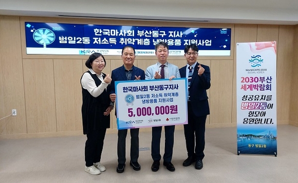 한국마사회 부산동구지사는 부산시 범일2동 지역사회보장협의체에 취약계층 냉방용품 지원을 위한 기부금 500만원을 전달했다고 9일 밝혔다.