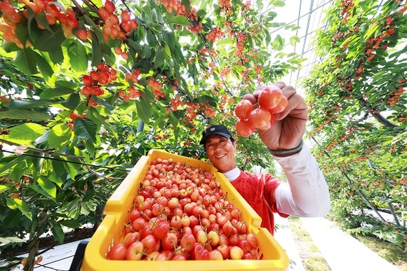 12일 경남 함양군 함양읍 가재골 체리농장에서 박대진씨가 직접 재배한 황금체리를 수확하고 있다. 함양산 체리는 비타민C와 피로회복, 불면증개선, 통증완화, 노화억제, 피부미용 등에 효능이 있는 것으로 알려져 있다. (사진=함양군 제공)