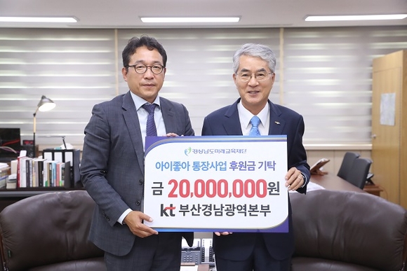 경남도미래교육재단은 12일 주식회사 KT 부산경남광역본부(KT)에서 박종훈 교육감실을 방문해 '아이좋아 통장사업' 후원금 2천만 원을 기탁했다고 밝혔다.