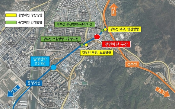 이번 교통제한은 도시철도 양산선(노포~북정) 2공구 건설공사 중 중앙고속도로지선을 횡단하는 강교 거치 작업을 하기 때문이다.