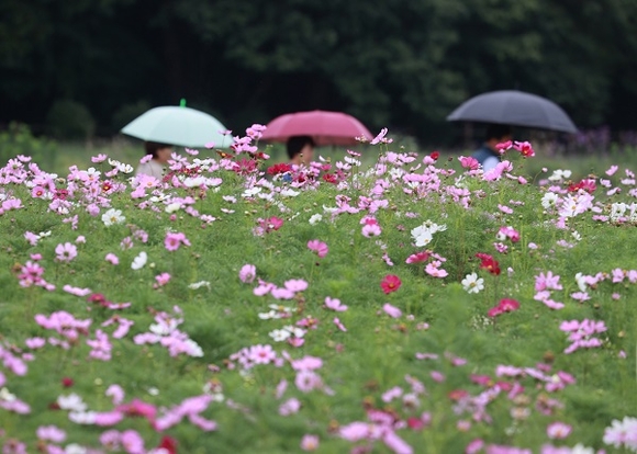 절기상 하지(夏至)인 21일 비가 내리는 가운데 경남 함양군 상림공원에서 때 이른 코스모스가 활짝 펴 관광객들의 눈길을 끌고 있다. (사진=함양군 제공)