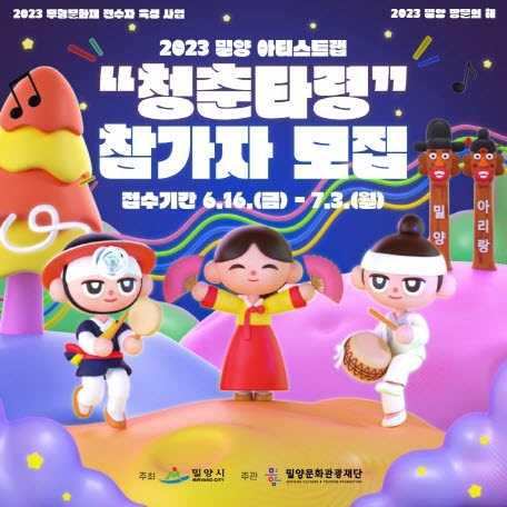 밀양문화관광재단이 오는 7월 3일까지 밀양 무형문화재 전수자 육성을 위한 2023 밀양 아티스트랩 '청춘타령' 참가자를 모집한다.