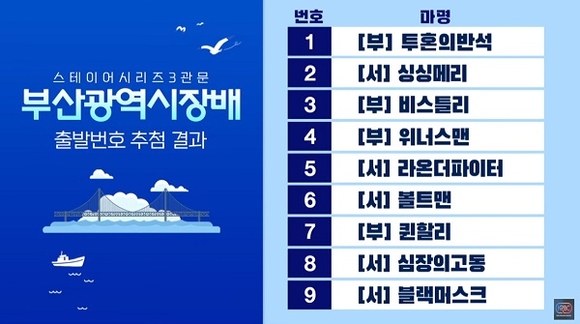 1년 전 첫 출전한 대상경주 '부산시장배'는 순위권에서 이름을 찾을 수 없었다. 그러나 꾸준히 큰 규모의 대상경주에 출전하며 실력을 키워 나갔고 '위너스맨', '라온더파이터'와 맞대결도 피하지 않으며 성장했다. 그동안 보여준 투혼으로 이제 위로 올라갈 일만 남았다. 출발번호 1번이다.