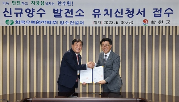 경남 합천군은 30일 합천 두무산 양수발전소 유치추진단 공동위원장 김윤철 합천군수, 조삼술 군의장이 함께 한국수력원자력 경주 본사를 방문해 양수발전소 유치신청서를 제출했다고 밝혔다.