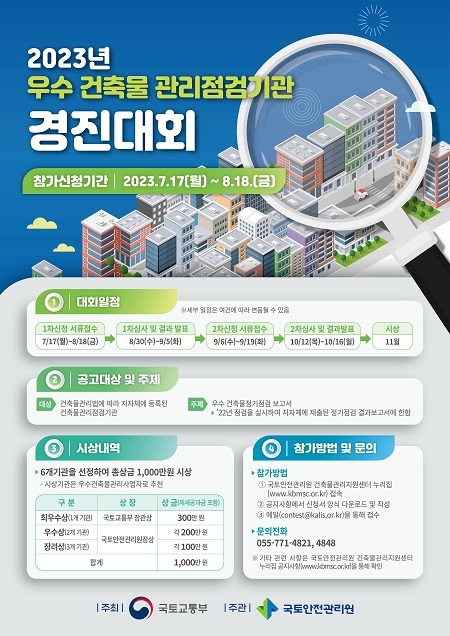 국토안전관리원은 건축물 정기점검을 수행하는 민간 기관들의 기술력 향상과 충실한 점검을 유도하기 위한 '2023년 우수 건축물 관리점검기관 경진대회'를 내달 18일까지 연다고 17일 밝혔다.