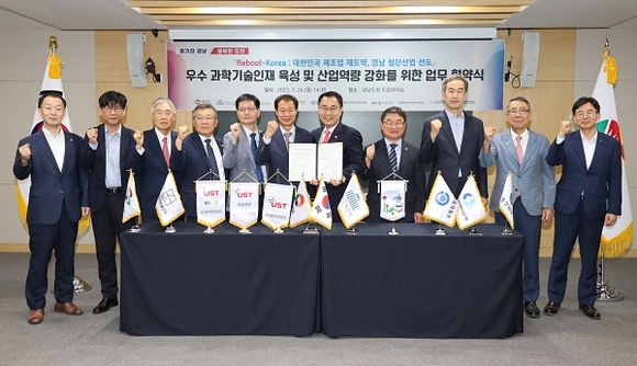 경남도는 24일 오후 도청 도정회의실에서 지산학연 대표 등 10개 기관과 함께 '우수 과학기술인재 양성 및 산업역량 강화를 위한 업무협약'을 체결함으로써 경남 과학기술기관 설립을 위한 첫걸음을 내디뎠다.·