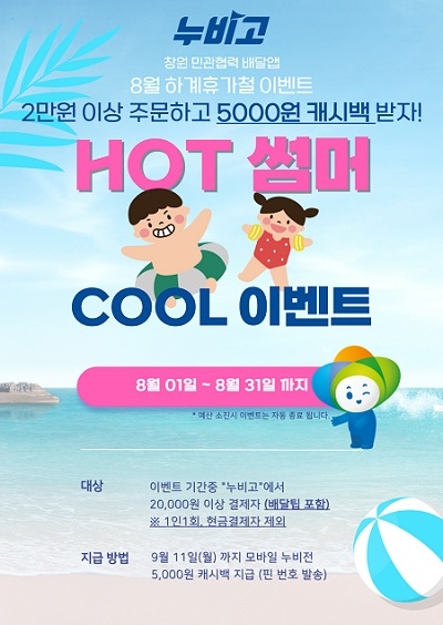 이번 이벤트는 8월 한 달 동안 배달앱 누비고에서 2만 원 이상 결제 시 9월 중에 모바일 누비전 5천 원을 캐시백으로 제공하는 행사이다. 많은 소비자가 혜택을 볼 수 있도록 1인 1회에 한하며, 예산 소진 시 조기 종료될 수 있다.