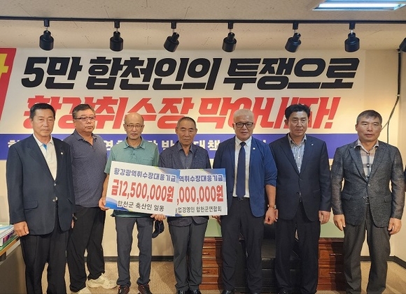 경남 합천군 축산인 단체와 합천농업경영인 합천군연합회는 28일 합천읍 소재 황강취수장 관련 군민대책위원회 사무실을 방문해 환경부의 일방적인 사업추진에 대한 강력한 반대 의지에 보탬이 되겠다며 황강 광역취수장 대응기금 총 1750만원을 기탁했다.