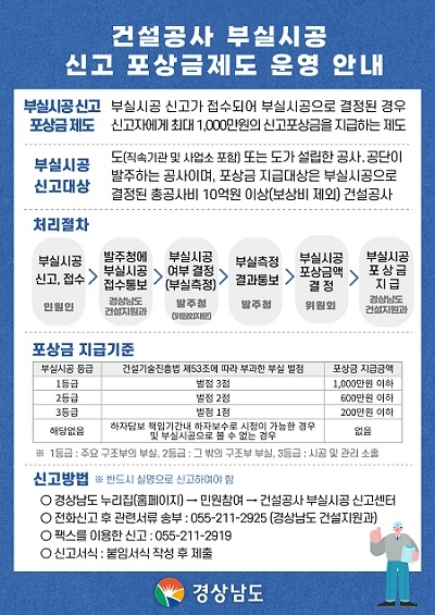 부실시공을 신고하면 최대 1000만 원의 포상금도 지급한다. 신고대상은 도가 발주한 총공사비(보상비 제외) 10억 원 이상으로, 공사 중이거나 하자담보책임기간 이내의 건설공사다. 지난 2월 '경상남도 건설공사 부실 방지에 관한 조례' 일부개정을 통해 신고대상을 확대·운영 중이며, 신고는 도청 누리집 건설공사 부실시공 신고센터를 통해 접수하면 된다.