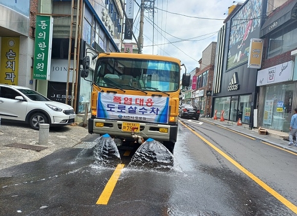 최근 폭염으로 인한 찜통 더위가 기승을 부리는 가운데 경남 사천시는 지난 5일부터 도심지 도로를 위주로 살수차를 운영하고 있다고 7일 밝혔다.
