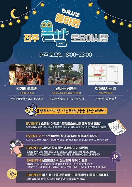 12일부터 개최될 진주문화재야행과 연계해 재개장할 올빰야시장은 오는 10월말까지 매주 토요일 오후 6시부터 11시까지 논개시장 일원에서 펼쳐진다.