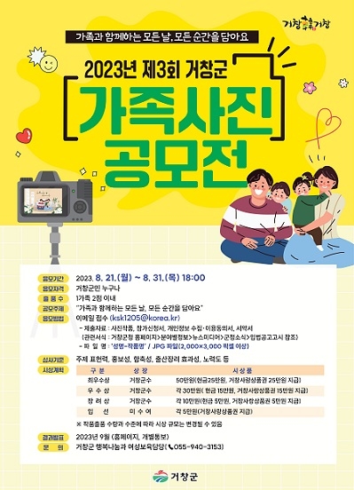 공모전 접수 기간은 오는 21일부터 31일까지며, '가족과 함께하는 모든 날, 모든 순간을 담아요'라는 주제로 △사랑스러운 아이의 출생·성장 모습을 담은 사진 △다양한 형태의 가족이 행복한 모습을 표현한 사진 △다자녀나 다세대가 함께 하는 행복한 가족사진 △거창의 명승지를 배경으로 찍은 가족사진 등이 공모 대상이다.