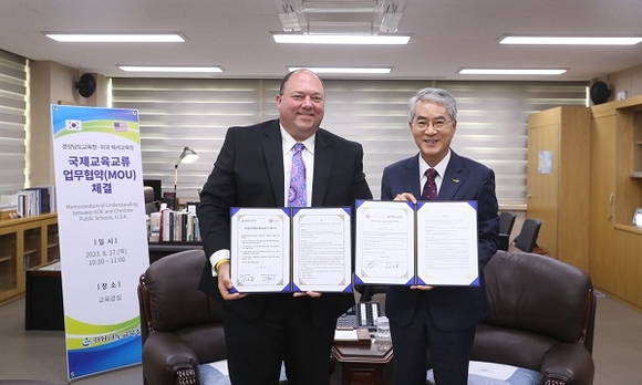 경남도교육청은 미국 코네티컷주 체셔교육청(Cheshire Public Schools)과 17일 교육감실에서 국제교육 교류를 위한 업무협약을 체결했다.
