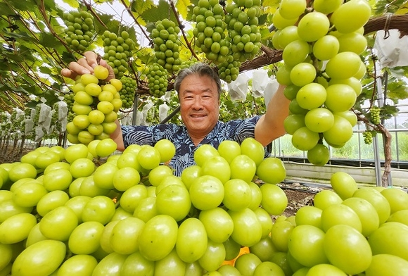 24일 경남 함양군 유림면 포도하우스에서 민갑식씨가 탐스럽게 잘 영근 샤인머스켓 포도를 수확하고 있다. (사진=함양군 제공)