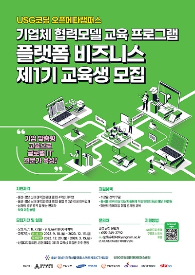 울산·경남지역혁신플랫폼 총괄운영센터는 USG 코딩 오픈메타캠퍼스 플랫폼 비즈니스 분야 교육생 40명을 내달 8일까지 모집한다고 31일 밝혔다.