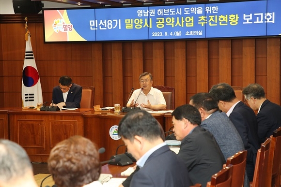 경남 밀양시는 4일 시청 소회의실에서 박일호 시장 주재로 민선 8기 공약사업 추진현황 보고회를 가졌다.