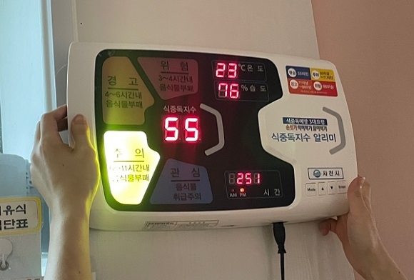 식중독지수 알림 전광판은 온도와 습도를 측정해 실시간으로 집단급식소 내 식중독지수를 알려주는 장치다. 관심(파랑), 주의(노랑), 경고(주황), 위험(빨강) 단계로 표기해 음식물 부패에 대한 단계별 대응 시간을 확인할 수 있다.
