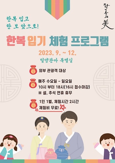 경남 밀양시는 오는 13일부터 밀양관아 북별실에서 관광객들을 대상으로 한복입기 체험 프로그램을 진행한다고 밝혔다.