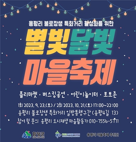 경남 함양군 도시재생사업 활성화를 위해 주민제안 공모사업으로 주민이 직접 기획하고 운영하는 '2023 용평리 별빛달빛 마을축제'가 오는 23일과 10월 21일 2회에 걸쳐 열린다.