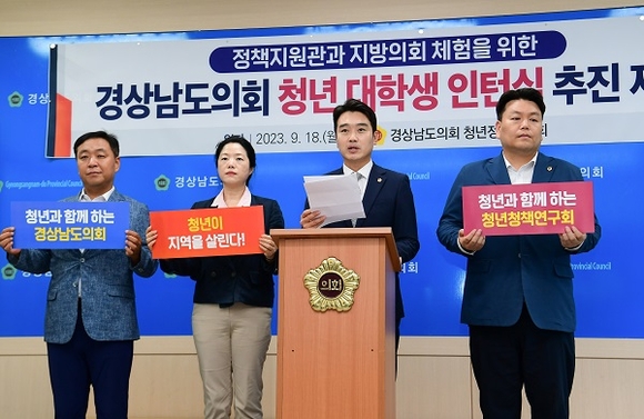경남도의회 의원 연구단체인 청년정책연구회가 18일 도의회 브리핑룸 기자회견을 열고 의정활동 지원과 정책지원관 양성을 위한 청년 대학생 인턴십 추진을 제안했다.