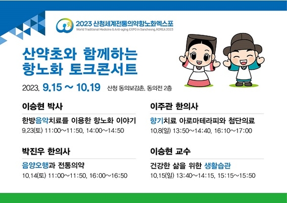 산청세계전통의약항노화엑스포조직위원회는 2023 엑스포 기간 중 특별행사로 오는 23일부터 동의보감촌 내 동의전에서 산약초와 함께하는 항노화 토크콘서트가 연이어 열린다고 20일 밝혔다.