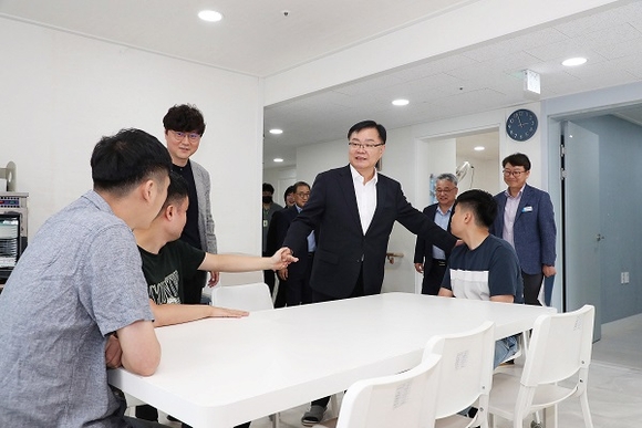 이날 첫 번째 방문지로 진해재활원을 찾은 홍남표 시장은 재활원 시설을 둘러본 후 종사자와 이용자들을 격려하고 현장 소리를 청취하는 시간을 가졌다.