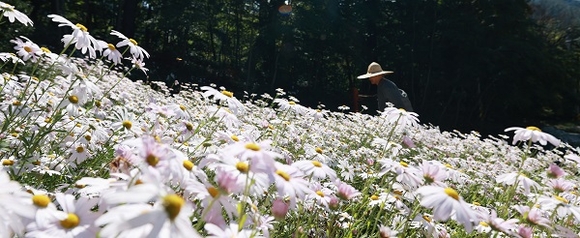 4일 경남 함양군 마천면 벽송사에서 스님이 활짝 핀 구절초 길을 산책하며 가을 정취를 만끽하고 있다. (사진=함양군 제공)