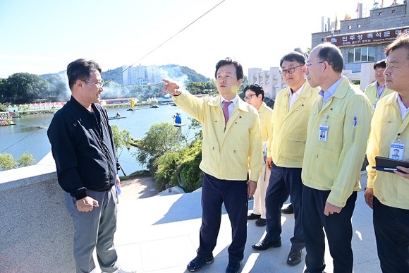 조규일 진주시장이 오는 8일 개막하는 진주남강유등축제가 펼쳐지는 진주성과 남강변 일원에서 축제 준비 최종 점검을 4일 실시했다.