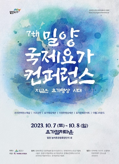 경남 밀양시가 주최하고 비베카요가가 주관하는 제7회 밀양 국제 요가컨퍼런스가 오는 7일부터 이틀간 선샤인 밀양 테마파크 내 요가컬처타운에서 '지금은 요가명상 시대(It's time for Yoga Meditation)'를 주제로 열린다.