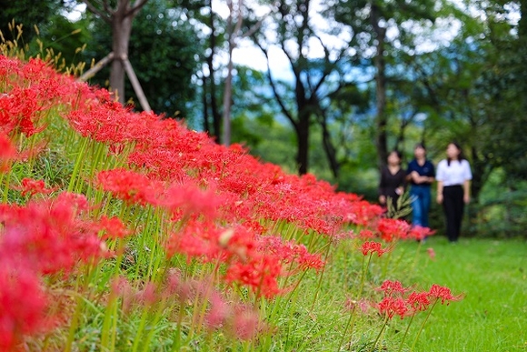 6일 경남 산청군 산엔청공원에 진홍빛 꽃무릇이 만개해 초가을 풍경을 자아내고 있다. 꽃무릇은 꽃이 필 때 잎은 없고 잎이 자랄 때는 꽃이 피지 않아 서로를 볼 수 없는 특성을 갖고 있어 상사화로도 불린다. (사진=산청군 제공)